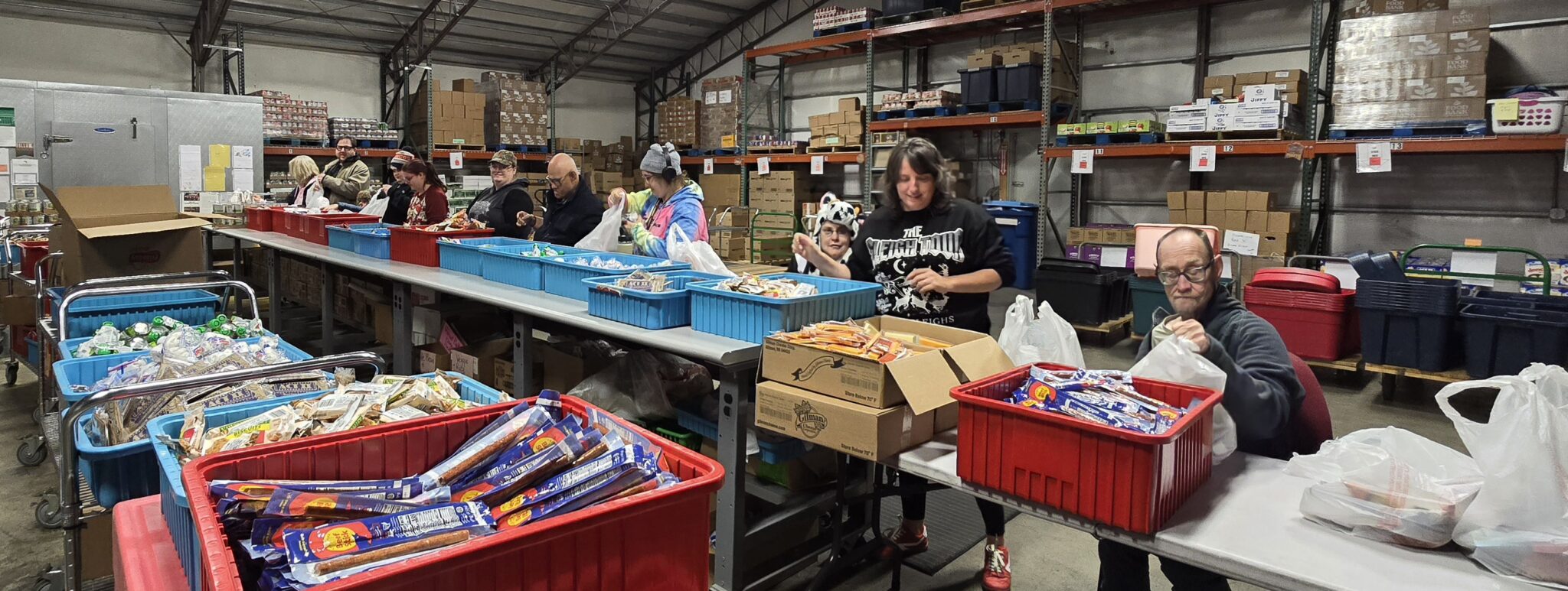 Every Tuesday, Wednesday, and Thursday, volunteers come to the warehouse and prepare the orders that will be distributed that week. Site Coordinators tell Kids Aid how many bags of food they need each week and share any unique circumstances or needed adjustments Sites are responsible for distributing the food to students.